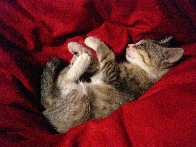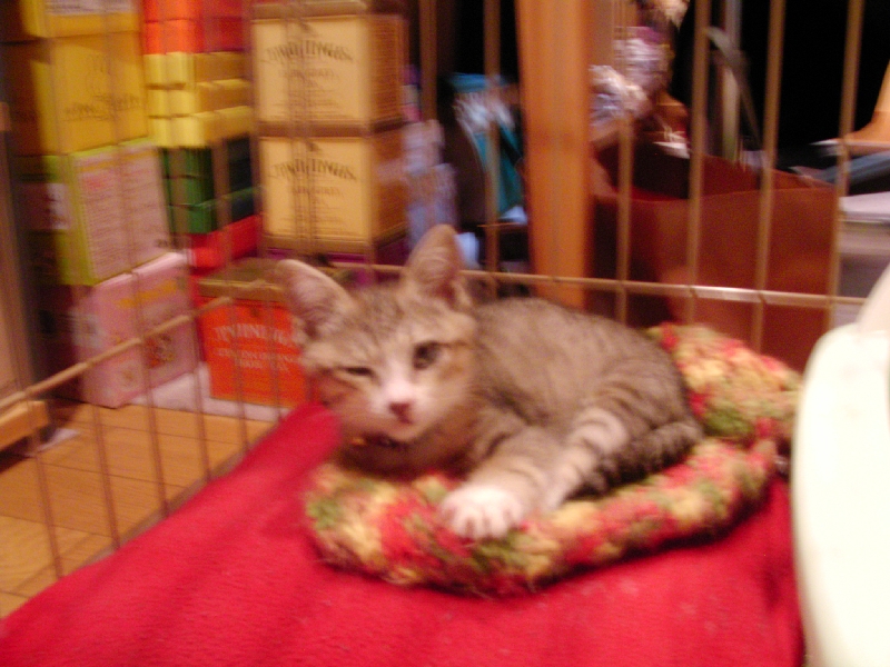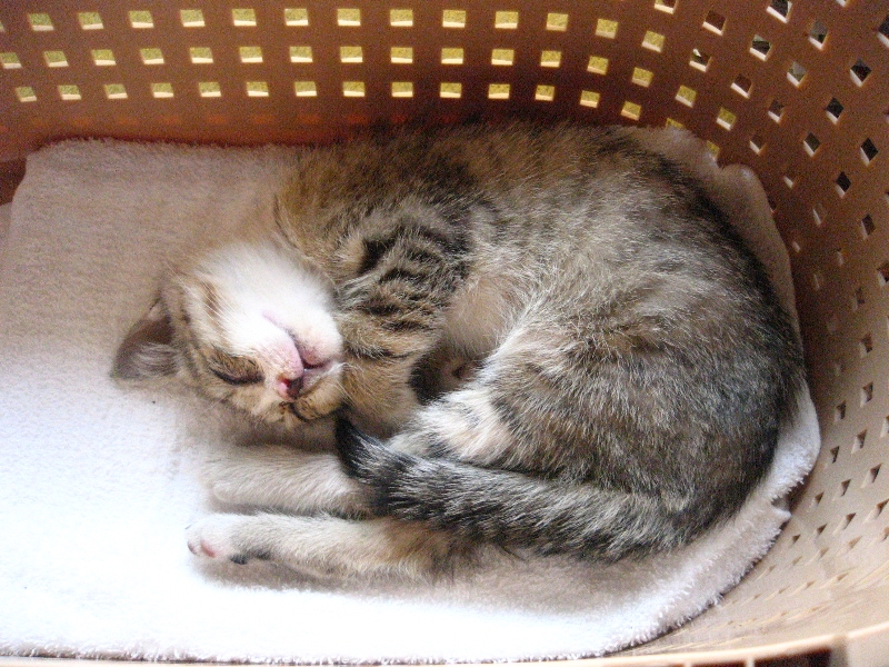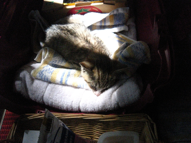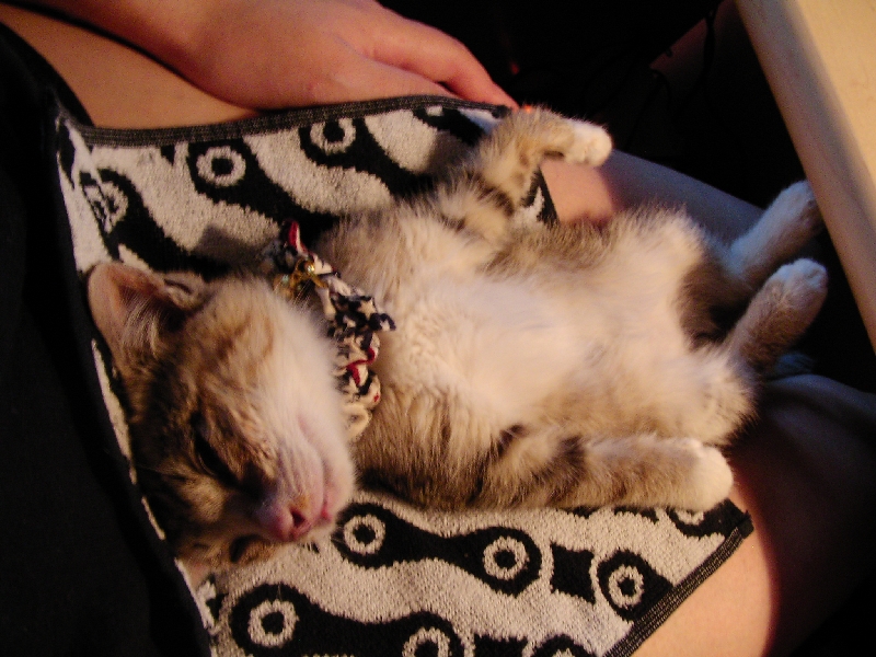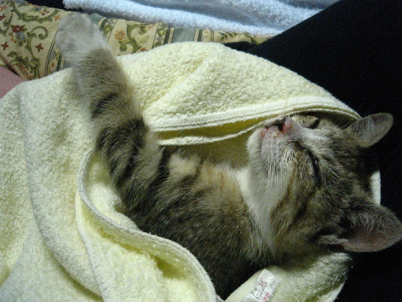 私の編んだモヘアのマフラーを寝床に提供 | |