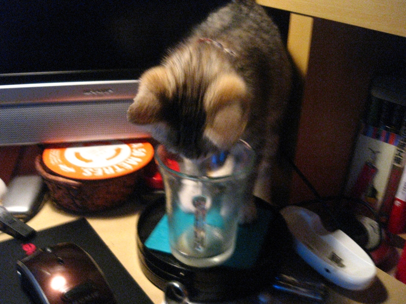 人様の飲み物に興味津々。届かないけどね(笑)